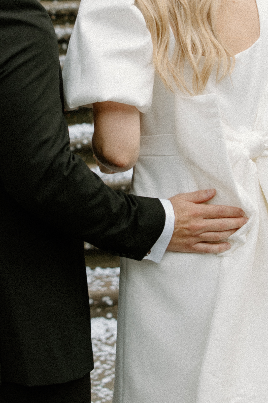 A statement bow, classic tux, and something blue. Gorgeous crisp florals against the elegant architecture of the town hall. Style emanated throughout this chic registry office wedding.